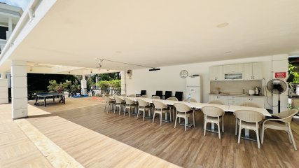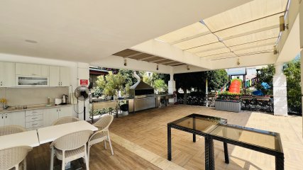 The apartment for sale, within a land area of 5,364 m², has a children's swimming pool, a large swimming pool, an indoor recreation area next to the pool, a barbecue area, a sauna, a Turkish bath, a gym, a children's playground, a parking lot, security, 24/7 security and security cameras, internet and also a generator.