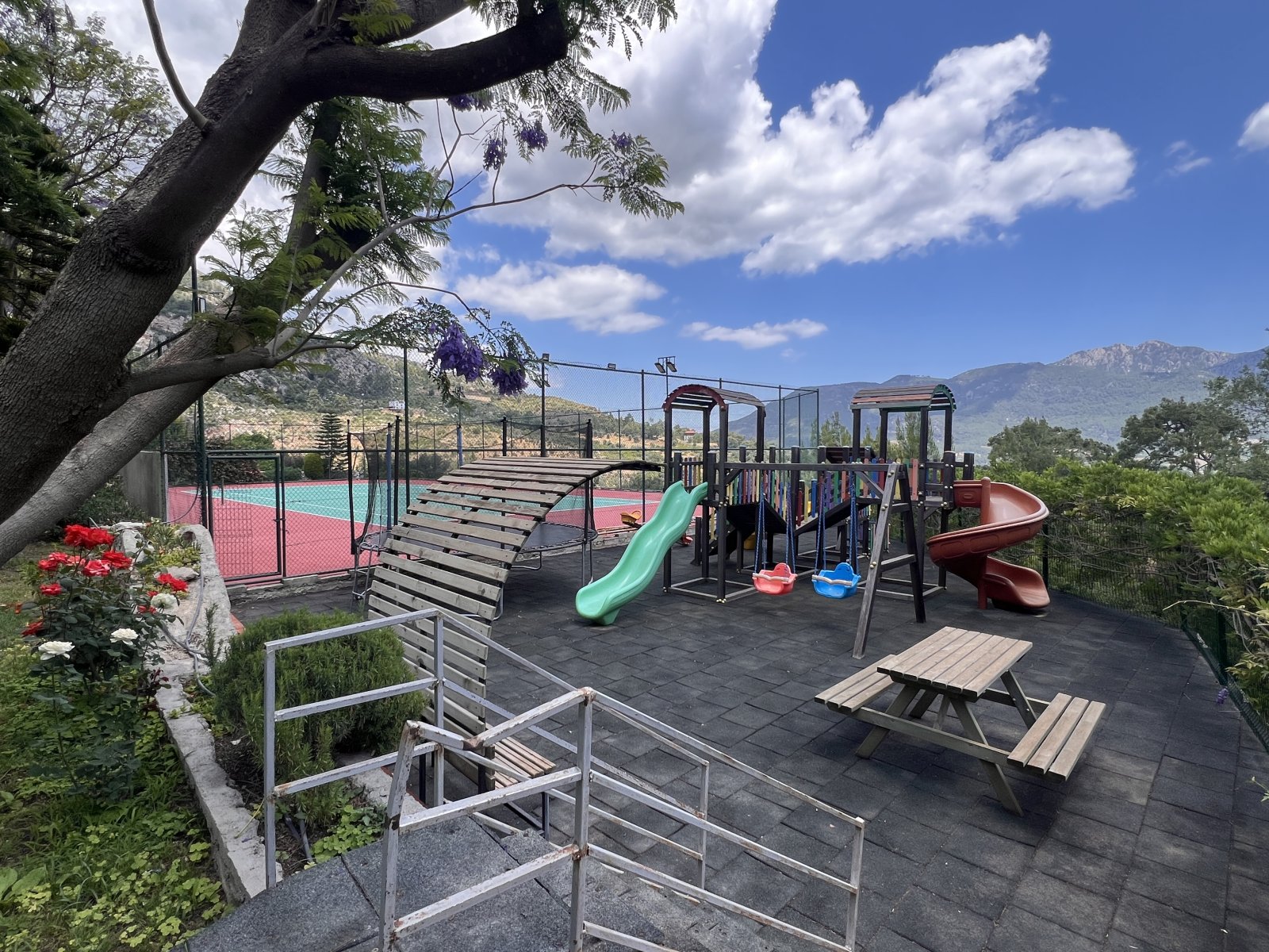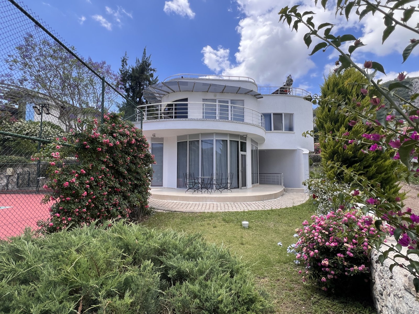 Villa kullanımına ait kaliteli tenis kortu, üç araçlık park yeri ve kamera sistemi bulunmaktadır.