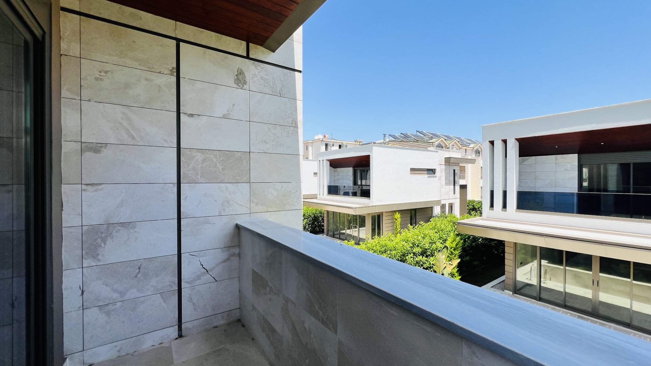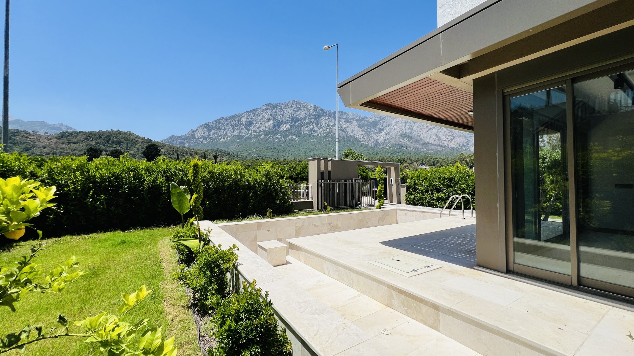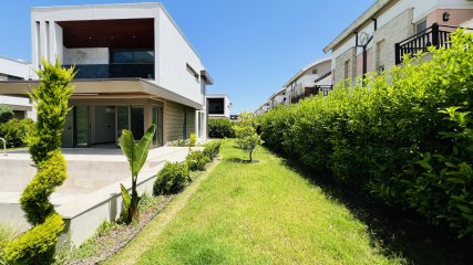 Villa müstakil, kendine ait bahçe, havuz ve otopark alanı mevcuttur. Toplam 352 m² arsa payı vardır. Eşsiz dağ manzarasına sahip satılık villa denize yakın konumu ile dikkat çekmektedir.