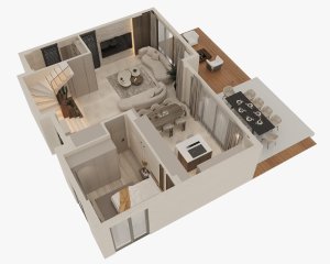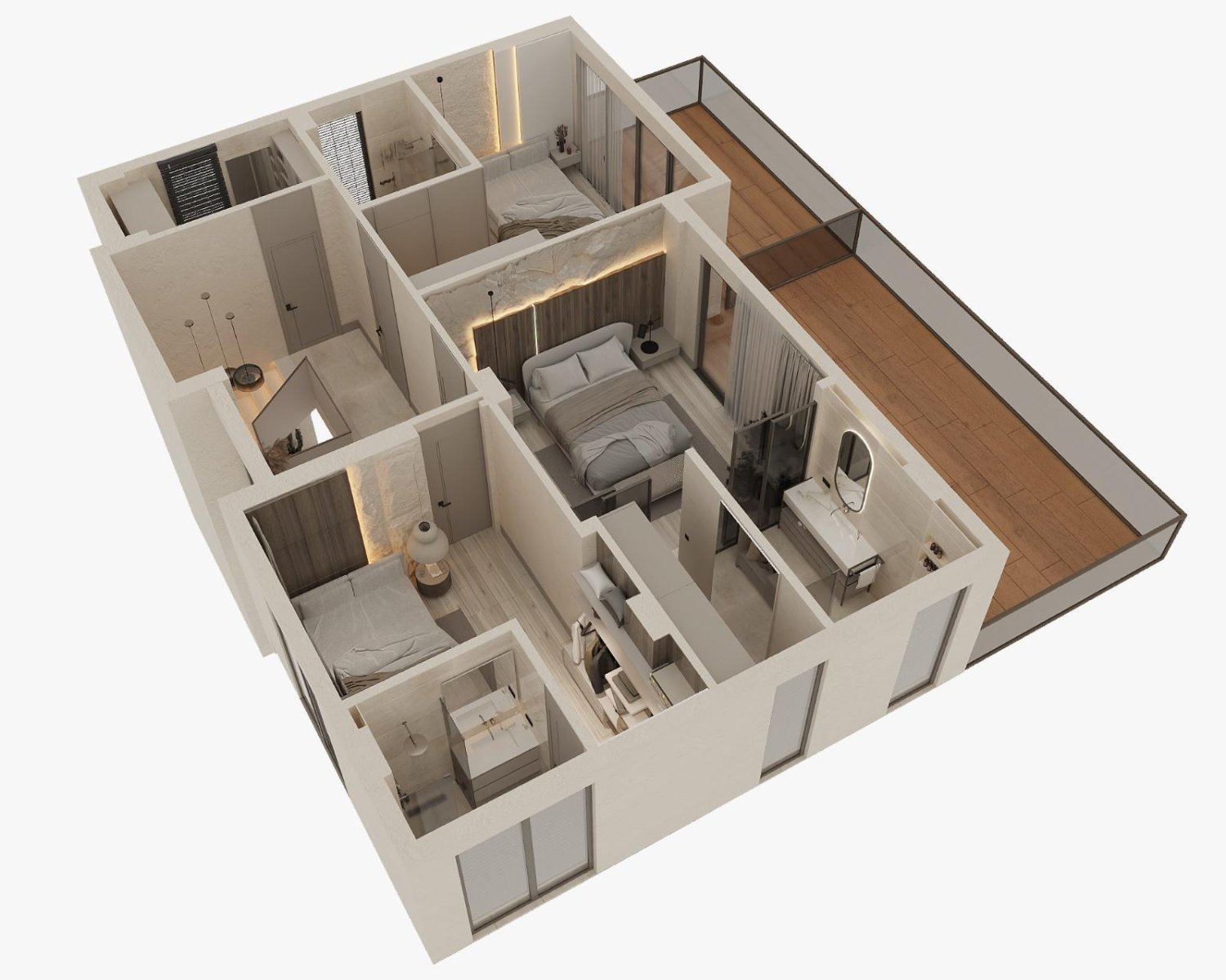 Üst kat özel yaşam alanı olarak tasarlanmıştır. Burada yer alan geniş yatak odalarının her biri kendine ait banyoya sahiptir. Ebeveyn yatak odasında ayrıca giyinme odası bulunmaktadır. Yüksek kaliteli ısı ve ses yalıtımı sayesinde odalar sessiz ve konforludur. Balkonlardan ve pencerelerden dağlara ve çevredeki doğal güzelliklere hâkim etkileyici manzaralar izlenebilmekte, bu da huzur ve mahremiyet hissi yaratmaktadır. Bu katta ayrıca bir çamaşır odası mevcuttur.