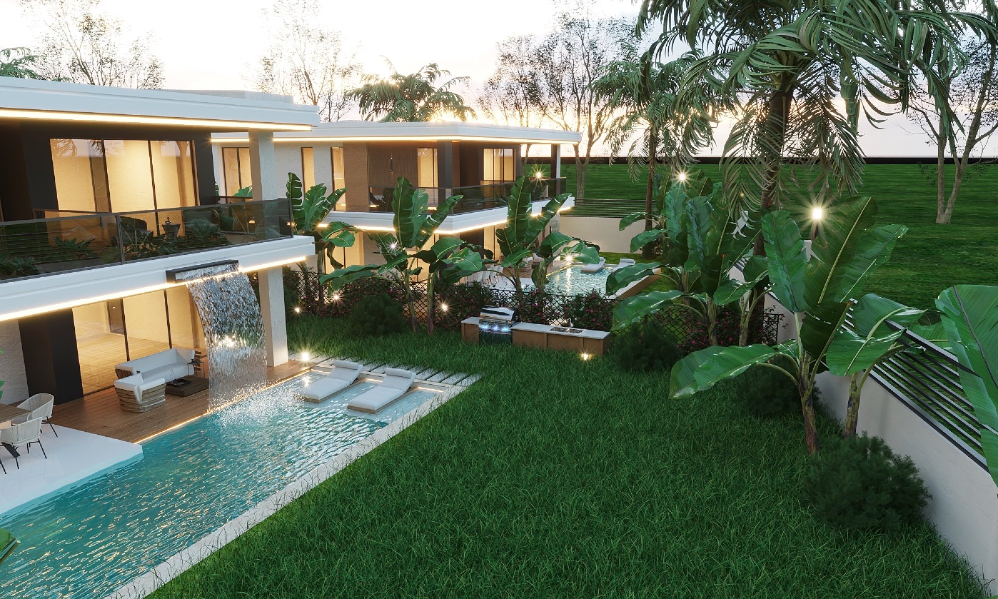 Villanın giriş katında geniş bir salon ve modern açık plan mutfaktan oluşan ferah bir yaşam alanı bulunmaktadır. Büyük pencereler sayesinde iç mekân gün boyu aydınlıktır. 45 m² genişliğinde terastan doğrudan bahçeye çıkış bulunmaktadır. Şelale efektine sahip özel yüzme havuzu bulunmakkta olup adeta özel bir tatil köyü atmosferi sunmaktadır. Bu katta ayrıca bir yatak odası ve misafir banyosu yer almaktadır.