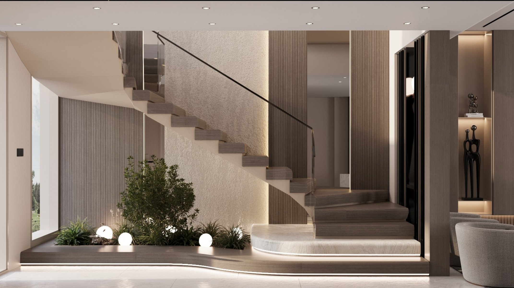 Giriş katında açık mutfak ile birleşen geniş bir salon, misafir tuvaleti ve geniş bir teras bulunmaktadır.