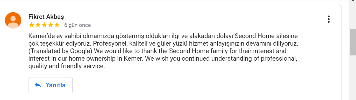 Second Home dan geçen hafta Antalya Kemer’ de ev aldık . Selda Hanım çok hızlı bi şekilde işlemleri gerçekleştirdi ve çok yardımcı oldu. Second home işinde çok uzman, kesinlikle ev almak ya da satmak isteyenlerin gönül rahatlığıyla kullanabileceği en iyi adres.