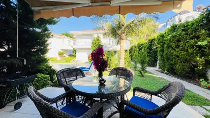 Die zum Verkauf stehende Doppelvilla besteht aus zwei aneinandergebauten Doppelhäusern in einem Gebäude. Das Eckgebäude mit Blick auf den Garten steht zum Verkauf. Es bietet Blick auf den Pool, den Garten und die Berge. Die Anlage besteht aus insgesamt vier Gebäuden und acht Eigentümern. Garten und Poolbereich werden gemeinsam genutzt. Der Eingang ist verschlüsselt, und die Anlage wird sorgfältig verwaltet. Die gesamte Anlage ist mit Überwachungskameras ausgestattet.