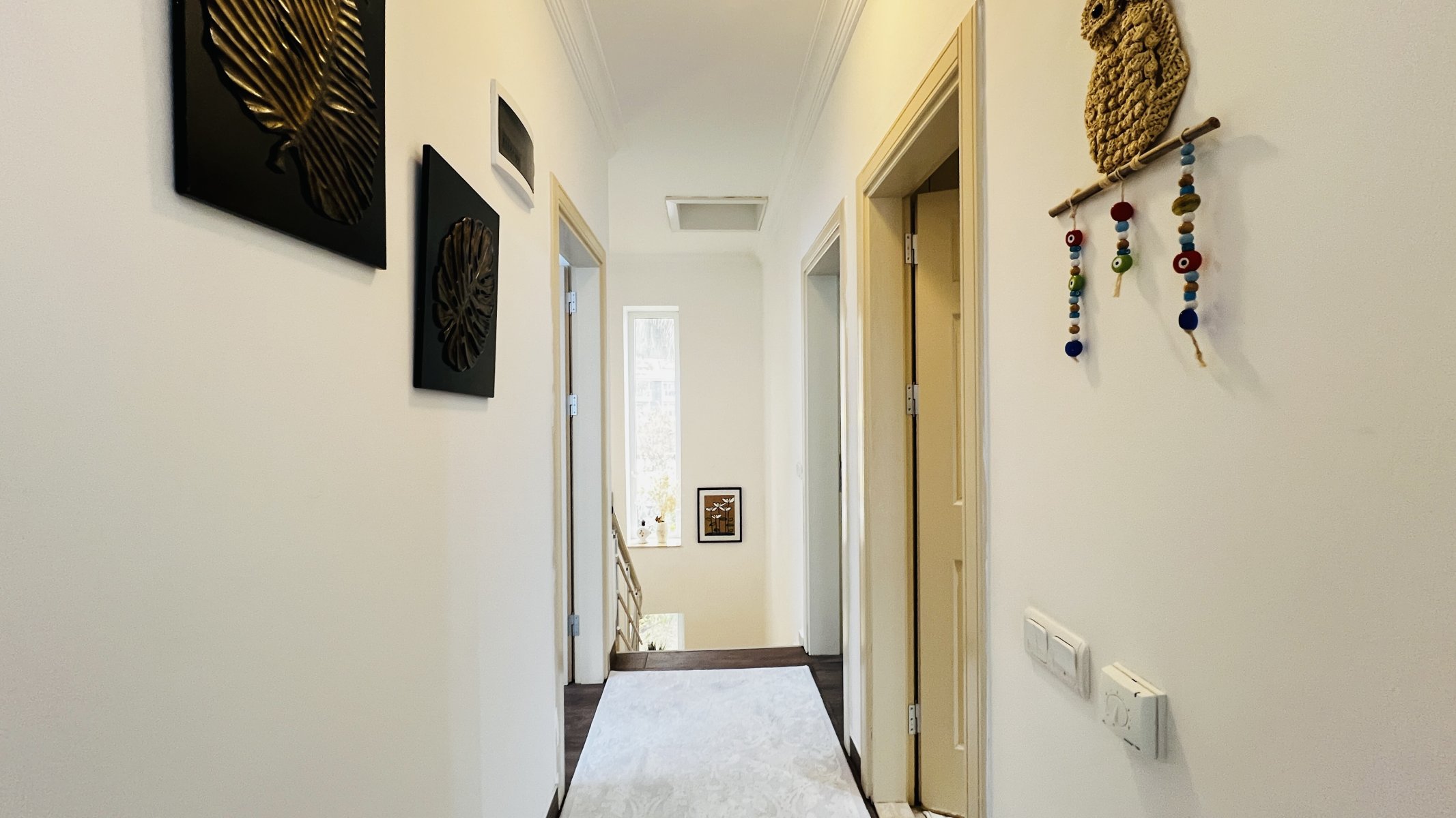 Die erste Etage der zum Verkauf stehenden Doppelvilla umfasst: drei Schlafzimmer und ein Gemeinschaftsbad mit elektrischer Fußbodenheizung. Das Hauptschlafzimmer verfügt außerdem über einen Balkon mit Wald- und Poolblick.