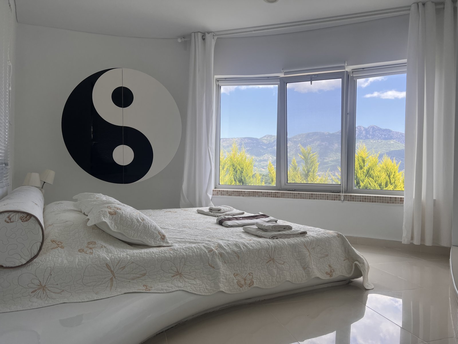 Satılık villanın ikinci katında: oturma odası, açık mutfak, yatak odası, hol, banyo, dağ ve bahçe manzaralı teras vardır.